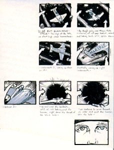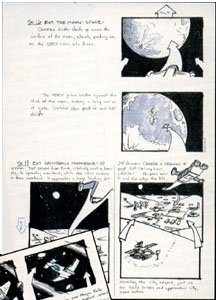 "You don't get the width on television, so instead, we tried to go with a lot of depth in our shots," he adds. "We do a lot of foreground, midground and background elements. We're very conscious of trying to break it up, so there's a lot of foreground, and the equivalent of a horizon." An example of this can be seen in the pilot episode. The Tellus colonists walk across a gantry to board the AeroTech rocket which will hurl them into space. "The only thing that's real in that shot is the actors," says McHugh. "Everything else is artificial. To give the shot a little bit of depth, we added a helicopter way off in the background. It gives some dimension, some realism." A primary element in many of the show's effects shots would be the 58th's Hammerhead fighters. "Knowing they wanted a World War II look, we looked at the Corsair fighter airplane and I said, 'I want this thing to look like this is the great, great grandson of the Corsair,'" says McHugh. "Our notion was that in the future, the Earthlings are new to space exploration, and so everything we do is based on the jet. We took our jets and moved them into outer space," he says. This extended to the fighters' movements. "We look at horizons, we fly in formations. It has a very earth-bound feel to it, because we're new out there." The enemy Chig fighters, on the other hand, would be distinctly alien. "The Chigs, we decided, have been in space much longer," says McHugh. "They've been running around, destroying civilizations, having a good old time. They fly differently. They kind of swarm. We very specifically designed [the Chig fighter] so that you're never quite sure exactly what it looks like. It doesn't really give off light, it just reflects it." Lighting effects opened up numerous dramatic possibilities for the effects artists. But since many of the shots in Space involved blue-screen elements of, say, a pilot sitting in a fighter cockpit, McHugh and Visual Effects Supervisor Glenn Campbell had to ensure the lighting in the CGI matched what was being filmed on the soundstages. "I'm not sure where it's written, but the blue screen stuff is always the last thing shot," says McHugh. "It's the last night, the last hour, the guys have been working a fourteen-hour day, and then they turn the blue screen on. It's hard on an actor." "When Glenn Campbell went down to film plates for the Hammerhead cockpit shots, we got a big lighting rig and swung it up there so there's light raking across the guys," says McHugh of using lighting to make scenes more dynamic, as well as to aid continuity. "You get real dramatic lighting, working interactively. That makes a huge difference. "We have a magic universe in terms of lighting," he adds. "No matter where you are, you're backlit. It comes from the same place as the music does." Area 51's computer effects sequences begin as carefully detailed storyboard scenes. After the action is choreographed, the team often bypasses creating any three-dimensional models, and simply inputs the action onto the two-dimensional canvas of the computer, building wire-frame models and then adding details.